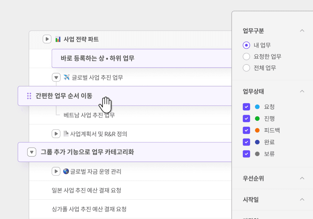 폴더처럼 정리된 하위 업무 구조로 업무 흐름을 관리합니다.