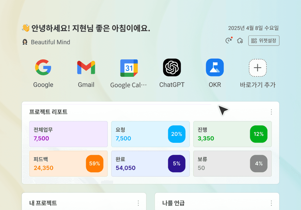 필요한 정보만 담은 나만의 대시보드에서 프로젝트, 일정, 미확인 알림 등을 확인할 수 있습니다.